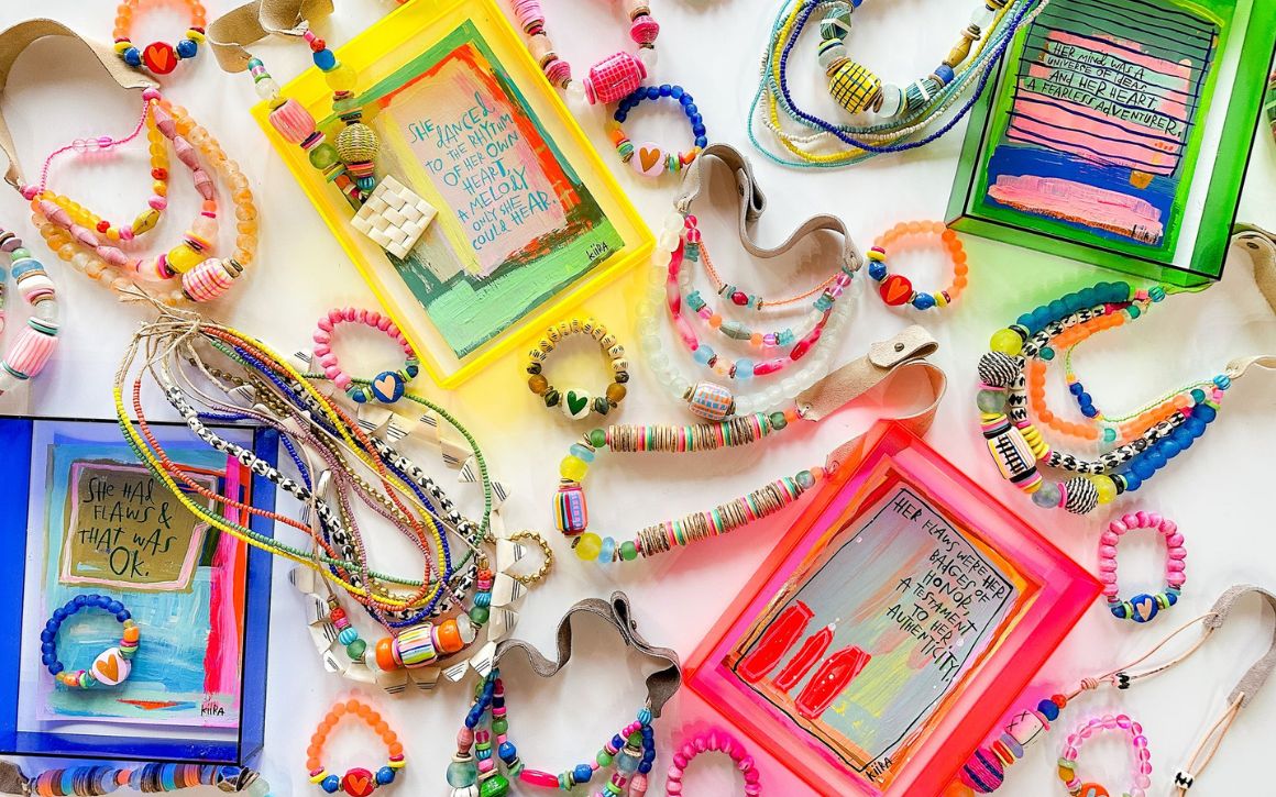 A collaboration that seamlessly blends two artistic souls. Inspired by Kiira's uplifting Pep Talks, Elizabeth and Jacquelyn envisioned their cherished quotes transformed into visual masterpieces through Kiira's remarkable artistic touch. Beyond an exclusive release of Pep Talks, the collaboration extends to exquisite, one-of-a-kind necklaces and bracelets, with Kiira hand-painting Twine & Twig's beads, resulting in captivating works of art.